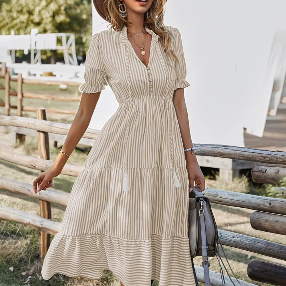 Verliebe dich in den boho-inspirierten Charme dieses leichten, gestreiften Kleids! Perfekt für Sommertage, Gartenpartys oder einen entspannten Stadtbummel, vereint es Eleganz und Komfort in einem einzigartigen Design.
