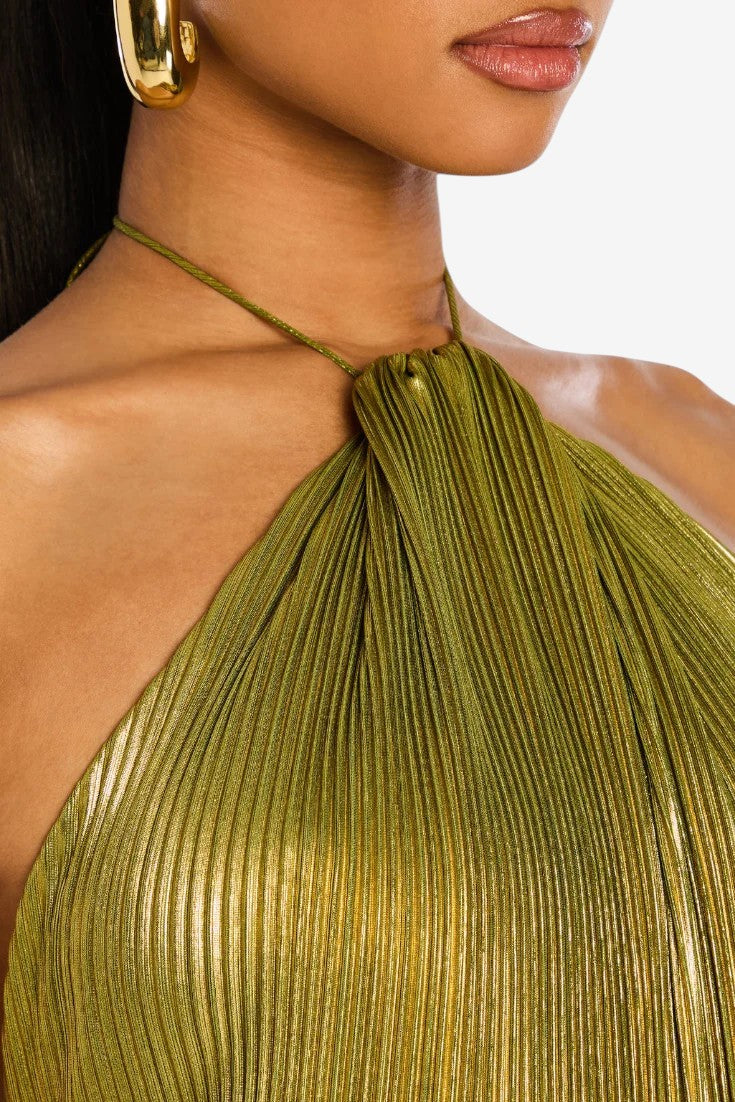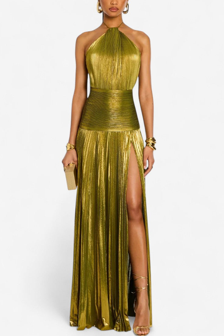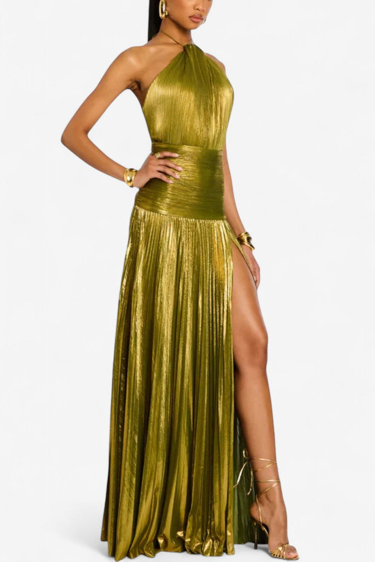 Kühn, strahlend und mit unvergesslicher Präsenz, definiert das Lorette-Kleid in metallischem Peridot-Grün modernen Glamour neu. Ihr skulpturaler Halterneck-Ausschnitt, der offene Rücken und der hohe Schlitz schaffen eine fließende Silhouette, die Licht und Blicke einfängt. Ideal für nächtliche Feiern oder Momente, in denen Sie mühelos strahlen möchten.